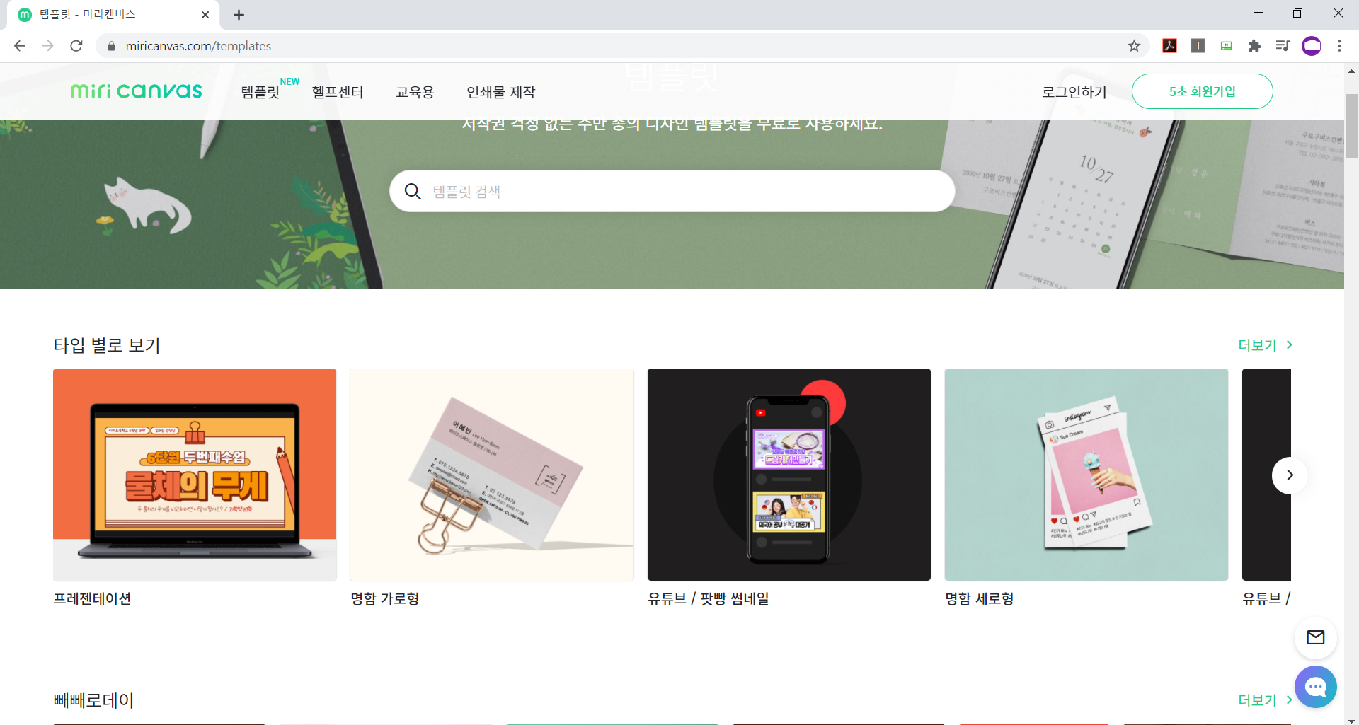 망고보드 하면 언제나 꼬리처럼 붙는 국내 템플릿 사이트계의 라이벌, 미리캔버스입니다.